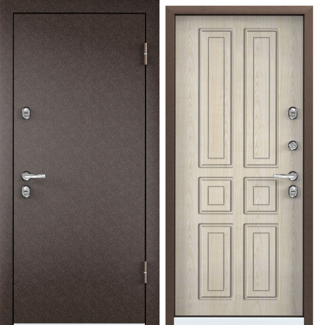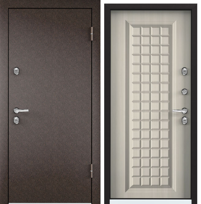 Дверь входная металлическая Термо С-2М — дверной блок со стальным коробом и створкой в современном стиле. Устанавливается в квартиру, частный дом, коттедж, другие отдельно стоящие здания. Эксплуатация двери в качестве наружной конструкции допускается при наличии защитного козырька или тамбура. Дверное полотно с двух сторон обработано порошково-полимерной краской от царапин и коррозии, утеплено пенополиуретаном. Наполнитель обладает звукопоглощающей и теплоизолирующей способностью. Короб оснащен стационарным порогом и двумя наружными петлями. Для защиты от проникновения установлены 2 замка: основной и дополнительный. Для защиты от холода и шума — контурный уплотнитель. Фурнитура состоит из обзорного глазка и хромированной стальной ручки. Конструкция монтируется накладным методом. Укомплектована дверным косяком.