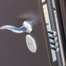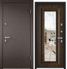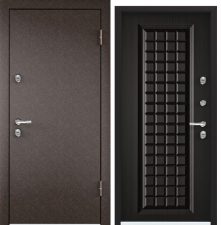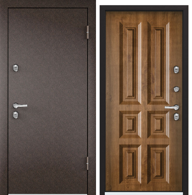 Стальная коробка оснащена стационарным порогом, тремя наружными петлями и тремя вставными контурами уплотнения. Стальная створка заполнена пенополиизоциануратом (PIR-плитой), имеет отделку внутренней стороны панелью МДФ толщиной 10 мм. Внешняя сторона обработана долговечной атмосферостойкой порошковой краской. Хромированные ручки двери устойчивы к износу, 2 сувальдных замка 4-го наивысшего класса взломостойкости и ночная задвижка обеспечивают надежную защиту от проникновения.